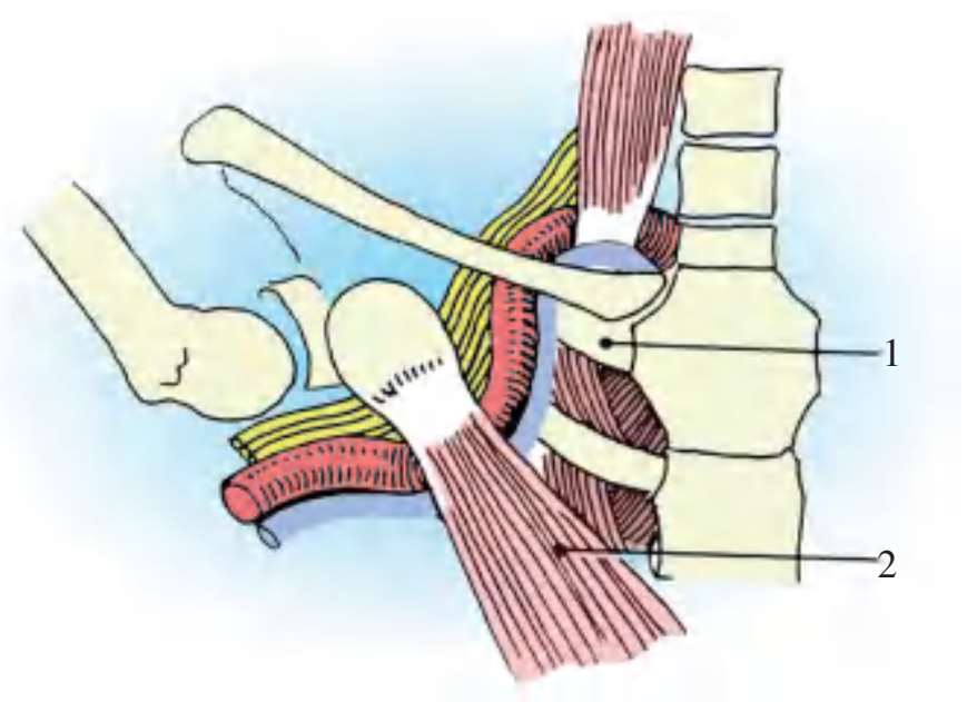 图2-16 已将前中小斜角肌的附着点切掉,从骨膜下剥离、游离第一肋骨