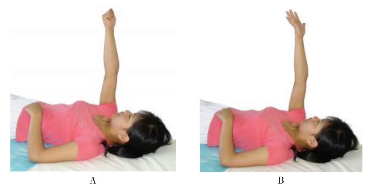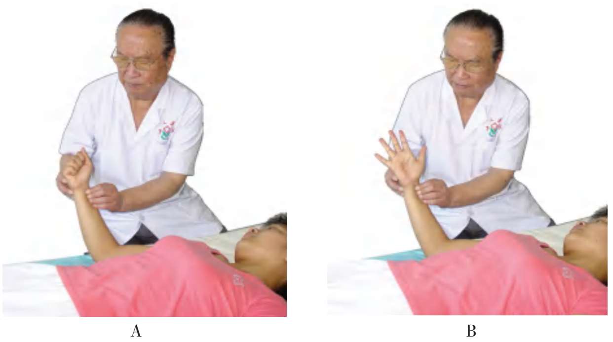 A.举臂握拳外旋;B.举臂伸手外旋:快速做握拳和张开动作,看是否出现疼痛和麻刺感