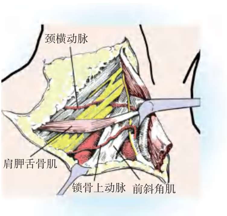 图2-11 横断胸锁乳突肌的锁骨头肌腱,显露肩胛舌骨肌、颈横动脉及锁骨上动脉,其深层即前斜角肌