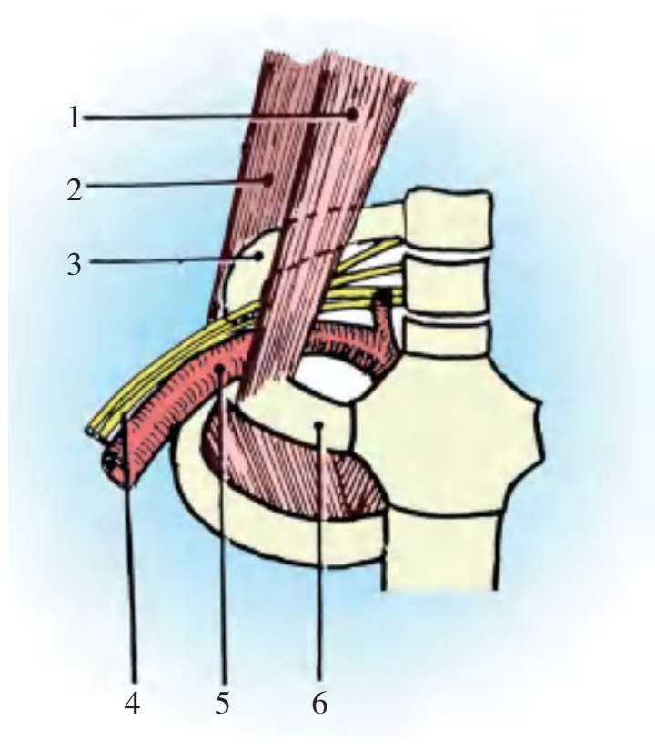 1.前斜角肌;2.中斜角肌;3.颈肋;4.臂丛神经;5.锁骨下动脉;6.第一肋骨