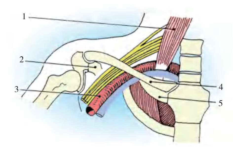 1.前斜角肌;2.喙突;3.锁骨下动脉;4.锁骨;5.第一肋骨