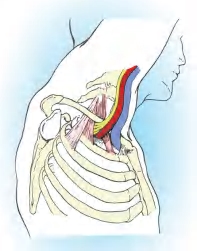 上肢过度外展时,胸小肌外侧缘压迫锁骨下动脉,引起过外展综合征(图2-4)。