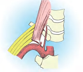 由于第一肋骨异常肥大、畸形,前、中斜角肌肥大,腱样化,或附着部异常及异常的小斜角纤维带的存在等,使斜角肌三角的间隙变小,引起前斜角肌综合征(图2-2)。