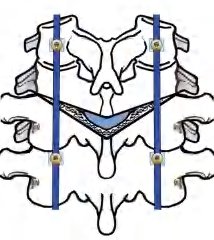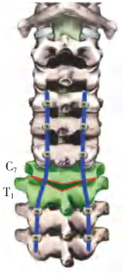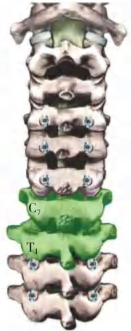 图2-66 上端C 4 、C 5 、C 6 置入侧块螺钉,下端T 2 、T 3 置入椎弓根螺钉,作钉棒系统内固定