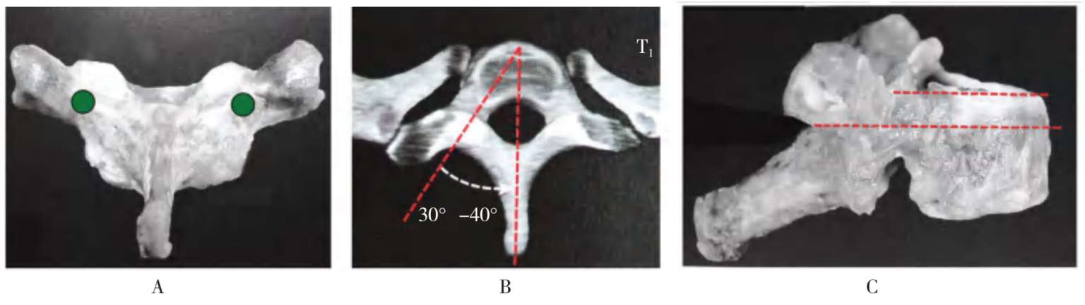 A.进钉点位于上关节面的下外方,相当于横突根部直径的中点;B.在轴像上向内倾斜30°~40°;C.在侧位像上与椎体上缘平行进钉