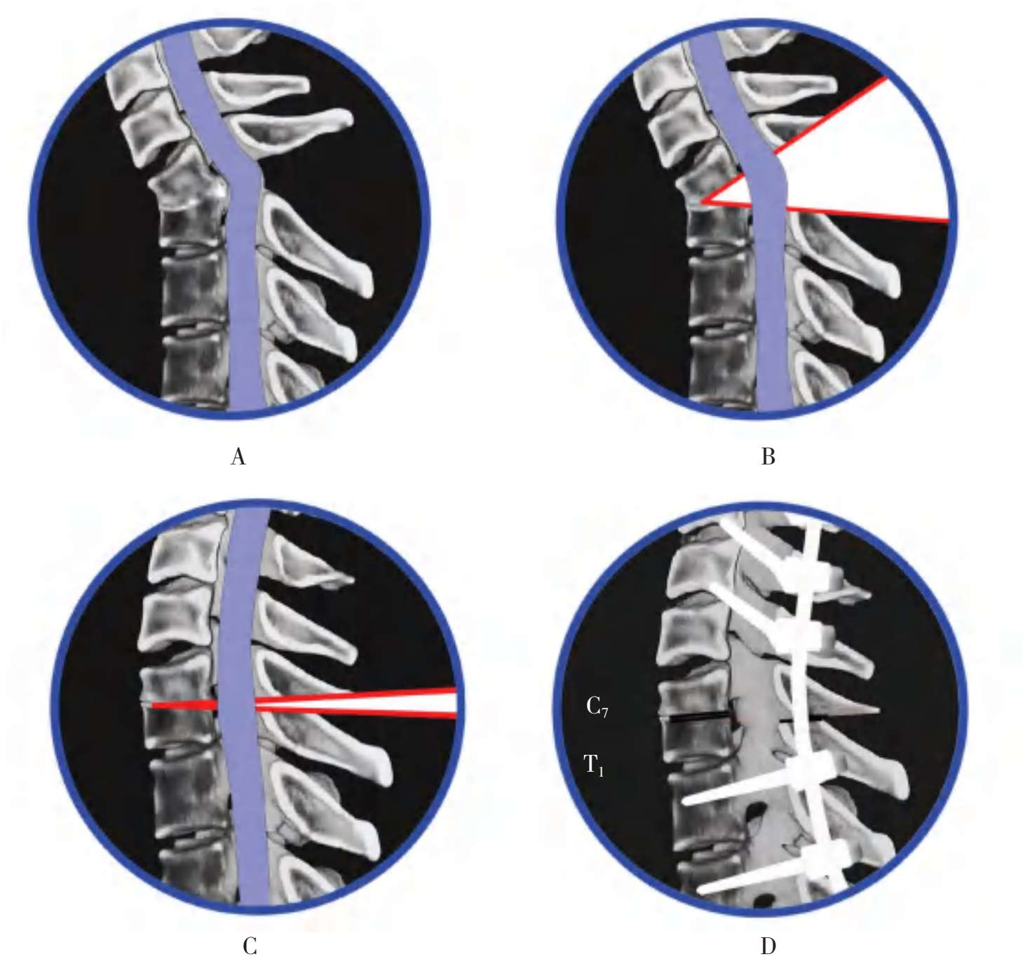 A.术前颈胸段后凸畸形,椎体后缘压迫椎管;B.椎弓椎体次全截骨术的切除范围;C.截骨矫正术后,切除了椎体后缘的突出物,解除了椎管受压情况,恢复了椎管的对线;D.钉棒系统内固定后,后凸角变为0°