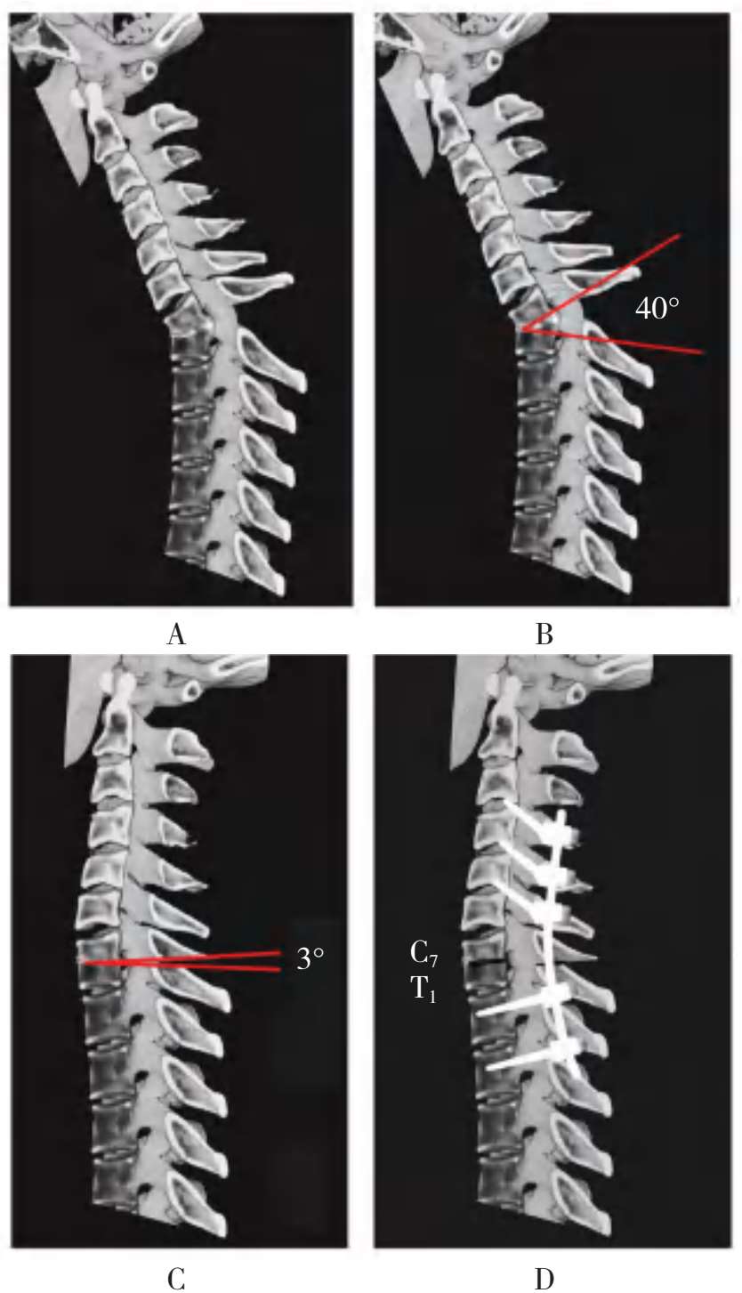 A.术前颈胸段后凸畸形47°;B.椎弓椎体次全截骨术的角度40°;C.截骨矫正闭合复位后,后凸角变为3°;D.内固定置入后,后凸角变为0°