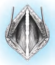 (2)暴露:切开皮肤及皮下组织,用自动撑开器撑开切口防止出血,保留棘上韧带和棘突的末端(图2-48),因为C 6 以上为双尾棘突,C 6 以下的棘突末端呈鼓槌状,利用这一特点将Luque棒夹在棘突的两侧不易滑脱,固定效果满意。沿棘突的两侧纵向切开,剥离暴露双侧椎板,将自动撑开器插入切口的深部,撑开两侧的椎旁肌肉,暴露椎板和横突(图2-49)。