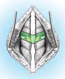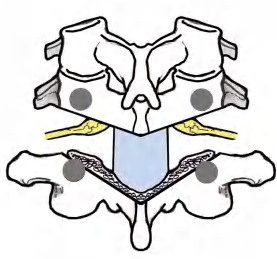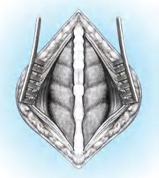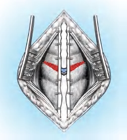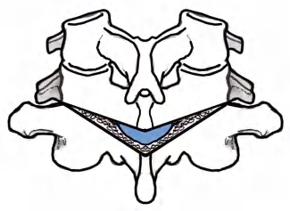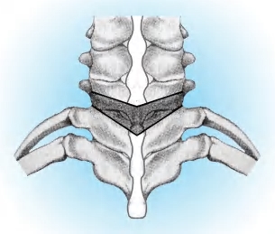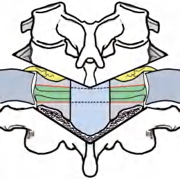 图2-48 沿棘突切口,保留棘上韧带和棘突末端,以备做Luque棒夹持棘突固定法