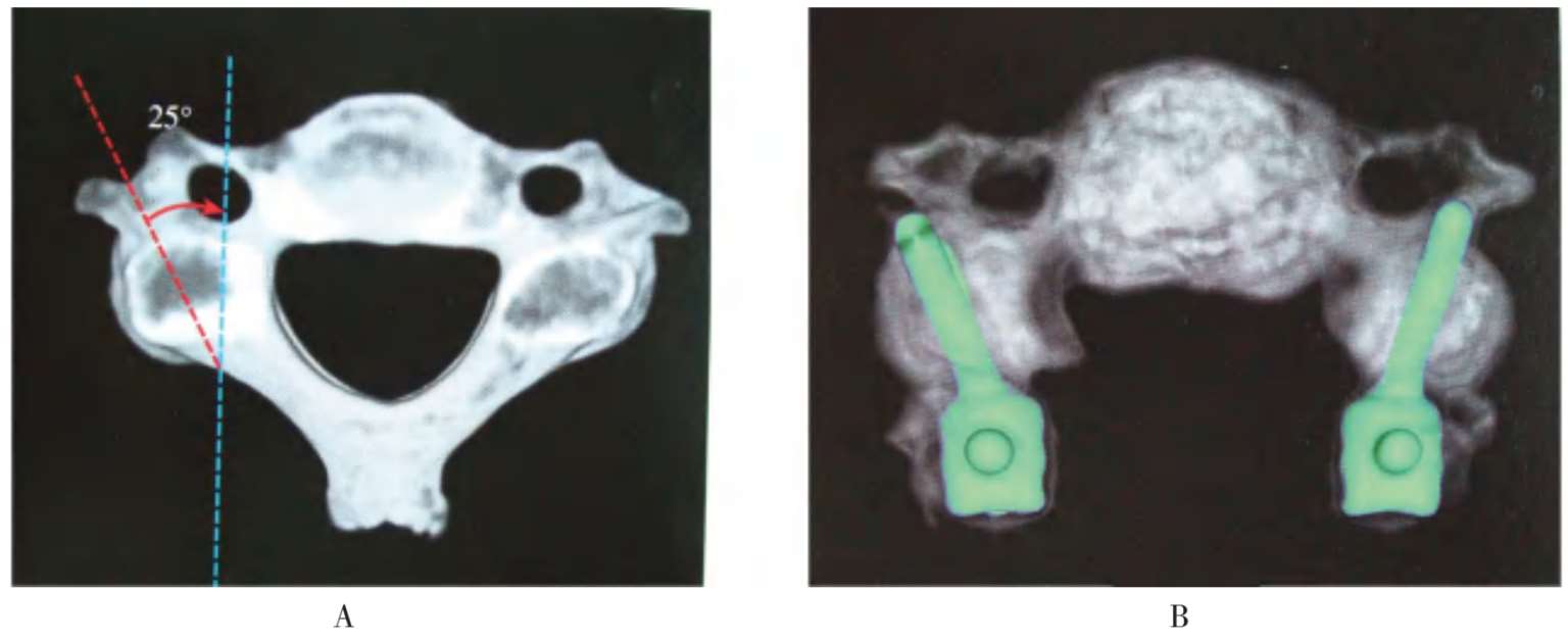 A.在轴像上向外侧倾斜25°;B.侧块螺钉置入后的位置