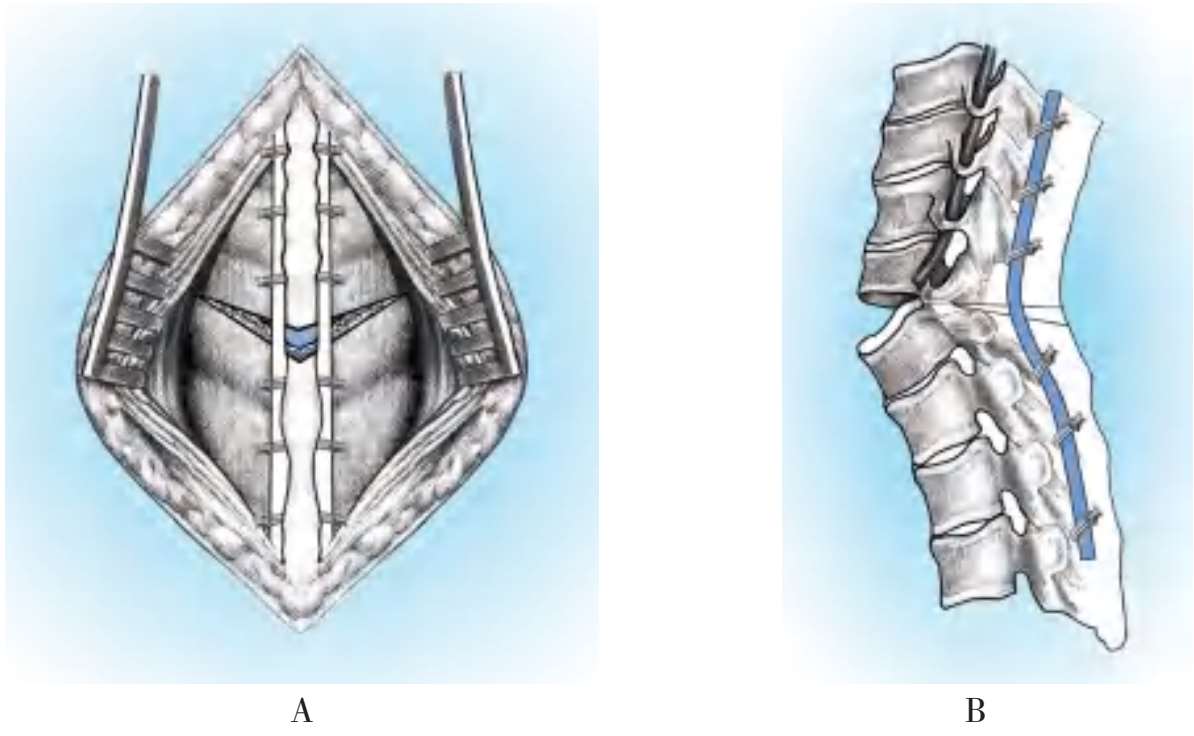 图2-54 Luque棒加钢丝夹持棘突固定法,因为强直性脊柱炎患者的棘突间韧带已骨化强直,给夹持棘突内固定创造了优越的条件