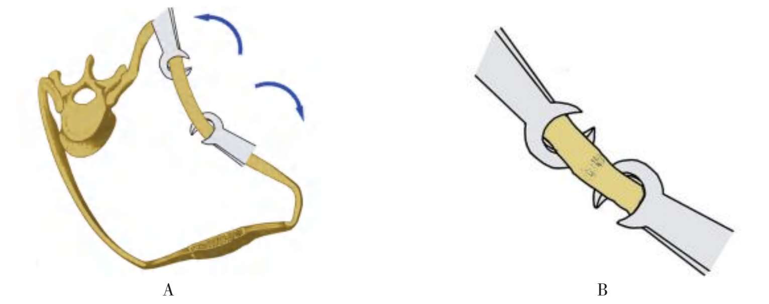 (2)切开肋骨骨膜,尽可能少地围绕肋骨剥离骨膜,通过两把肋骨折弯器将肋骨折弯变圆(图3-5、图3-6)。若需要多处肋骨折弯时,可按照同样方法操作。