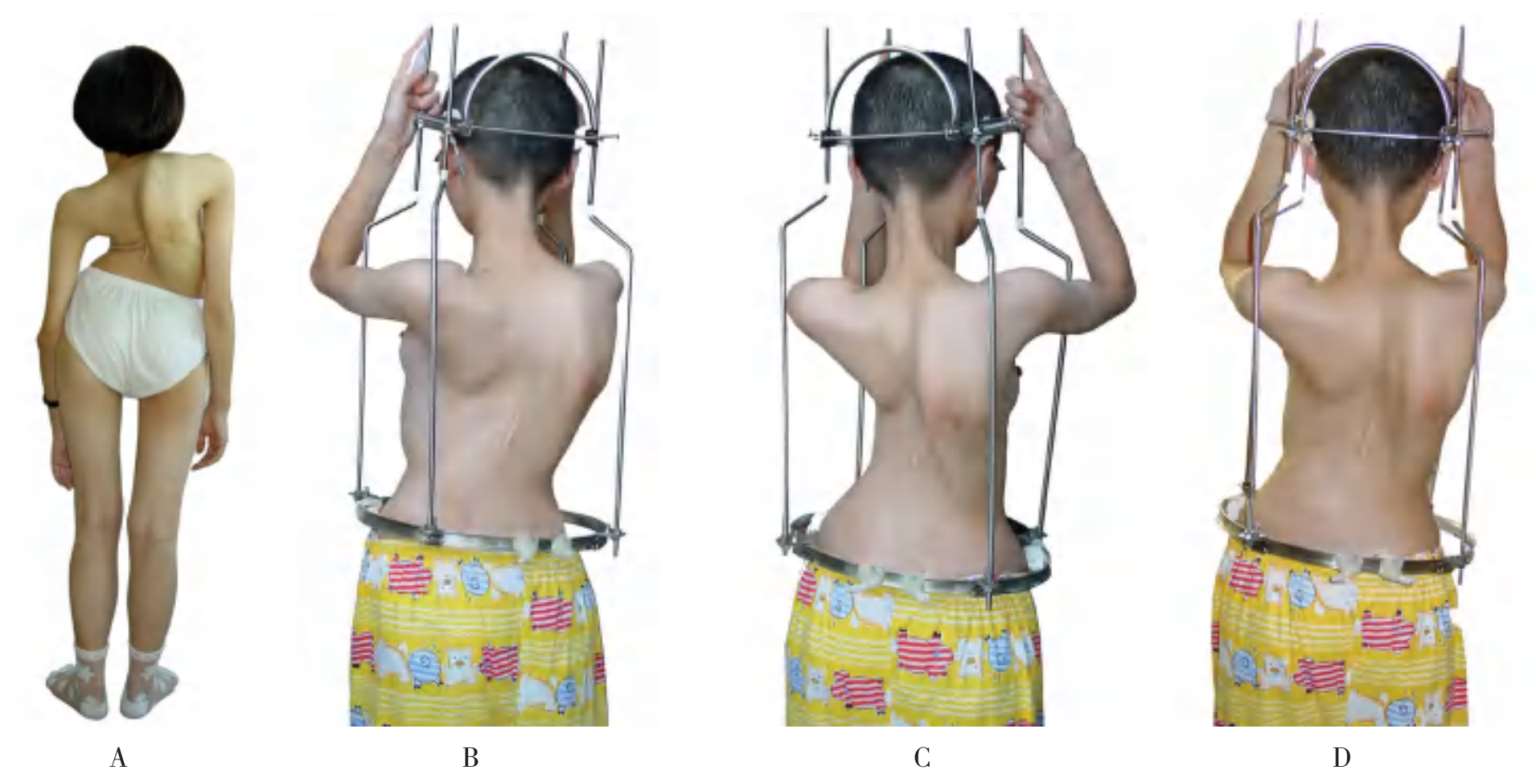 A.8岁患儿,身材单薄、消瘦,左侧胸廓塌陷严重,右侧剃刀背明显,是颅盆环牵引加水平牵引的适应证;B.颅盆牵引矫正脊柱侧弯到一定程度后,准备行胸廓塌陷成形术