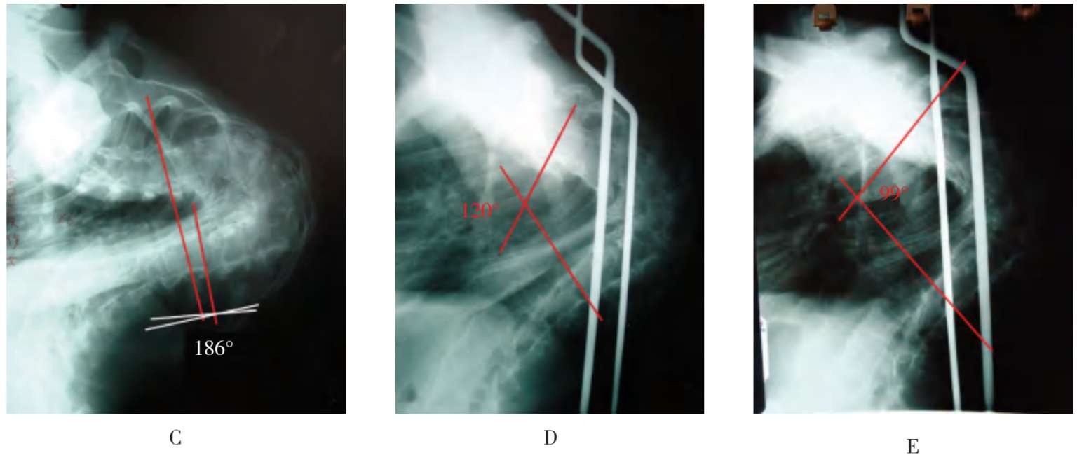 A.后面观,左侧剃刀背明显,右侧胸廓严重塌陷。B.侧面观,脊柱后侧凸明显,右侧胸廓严重塌陷肋骨变直,肋前缘翘起,胸腔矢状径加大,躯干部缩短。C.胸椎后侧凸Cobb’s角186°,为脊柱侧弯患者中最大的角度。其弯曲段已形成U形襻,比180°还超过6°,为一例稀有病例。D.经颅盆牵引30天,胸椎侧凸从186°变成120°。E.继续牵引至45天胸椎侧凸变成99°。下一步先做胸廓成形术,后做脊柱侧凸弹性分叉生长棒矫形术,因为对重度脊柱弯曲只有颅盆牵引加弹性分叉生长棒的治疗方法,才能产生内支撑内固定的作用,其他内固定器械难以发挥作用。F.术前,脊柱侧凸合并重度胸廓塌陷畸形。G.经颅盆牵引后胸廓塌陷大部改善。H.将4条肋骨折弯变圆后,用粗丝线加橡皮条固定在颅盆装置的立柱上做水平牵引。I.胸廓成形术已完成,拆除牵引线后见胸廓塌陷已隆起变圆,胸腔容积加大,碳氧交换明显改善,口唇、甲床发绀消失。J.在颅盆牵引局部浸润麻醉下的卧位。K.弹性分叉生长棒的固定方法,1棒与2棒的安装,椎板下钢丝固定在1棒上,提肋钢丝固定在2棒上,两棒交替撑开,弹簧已被压缩,使两棒之间形成矩形面,使其产生生物力学稳定效应。L.内固定术后戴颅盆环早期下床活动,躯干部延长,身高增加22cm,人体重心居中,行走方便,人体外形大为改善。M.背面观