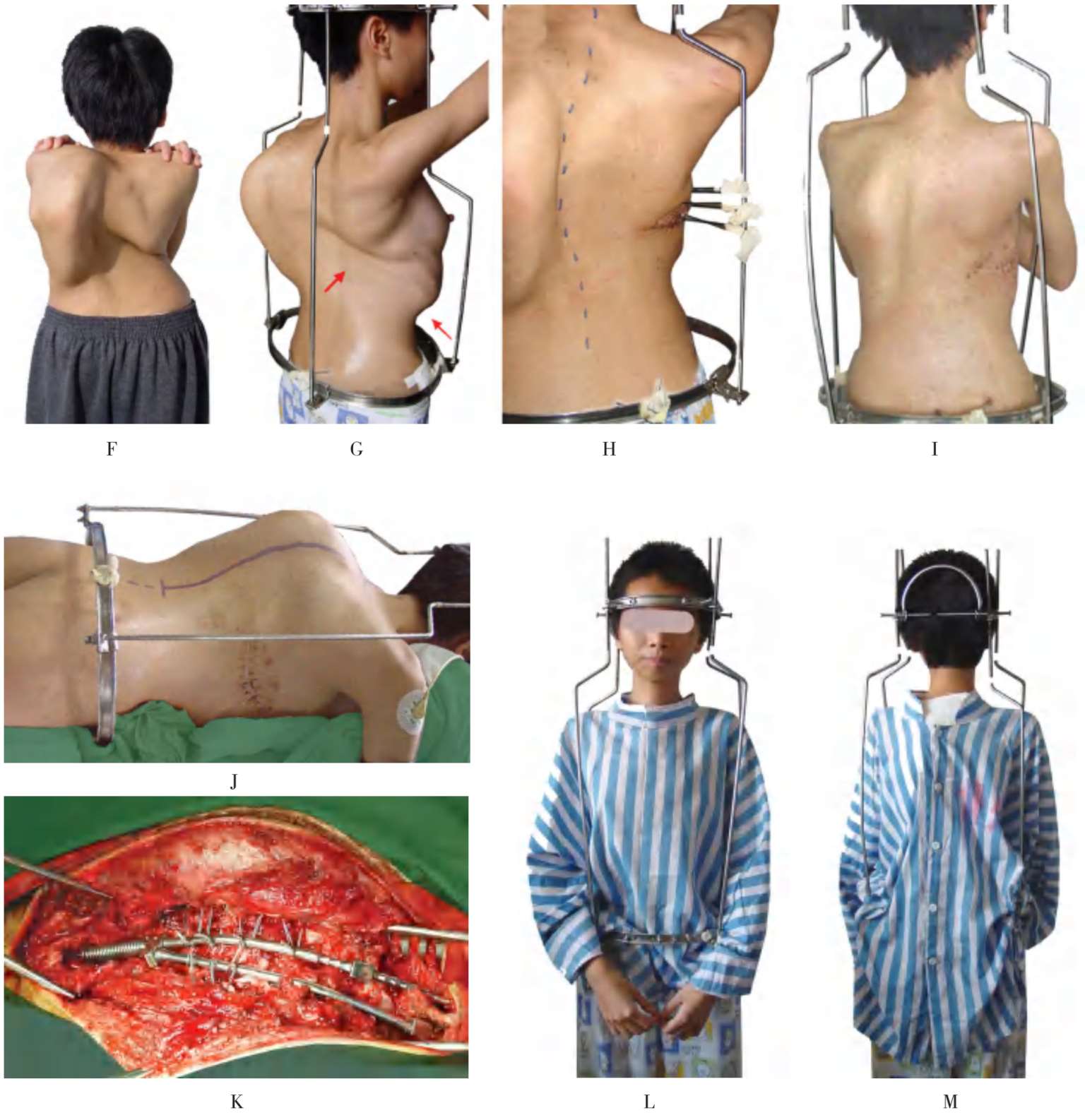 患者,女,17岁,先天性重度胸椎侧弯合并重度胸廓塌陷畸形(图3-9A、图3-9B),于2002年1月4日入院,术前X线片胸椎侧弯Cobb’s角186°(图3-9C),右侧胸廓严重塌陷,心肺功能受到严重影响,心跳加快,呼吸困难,口唇、甲床发绀。曾走遍全国各大医院,未得到收容治疗,特来我院要求手术。经颅盆牵引30天,胸椎侧弯从186°变成120°(图3-9D),继续牵引至45天胸椎侧弯变成99°(图3-9E)。然后行胸廓塌陷矫形术,术中将4条肋骨折弯变圆,吊在颅盆装置的立柱上,中间通过橡皮条做弹性牵引,3周后拆除牵引线,见胸廓已扩张变圆,外观明显改善(图3-9F至图3-9I),呼吸量增加,碳氧交换明显改善,以往的口唇、甲床发绀等缺氧现象恢复正常,给下一步脊柱侧弯矫正手术带来安全。于同年3月12日在颅盆牵引、局部浸润麻醉下,做了弹性分叉生长棒脊柱矫形术,术后恢复良好,身高增加22cm(图3-9J至图3-9M)。术后随访4年,一切均好,内固定尚未拆除。