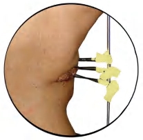 (3)然后取双股10号粗丝线用穿线导引器自肋骨下通过,再自切口的两侧软组织内穿出皮肤,连接橡皮条将其固定在颅盆装置上(图3-7)。每条肋骨均按此方法折弯固定,共做3~6条肋骨,然后分层缝合切口,放置橡皮片引流,手术结束。