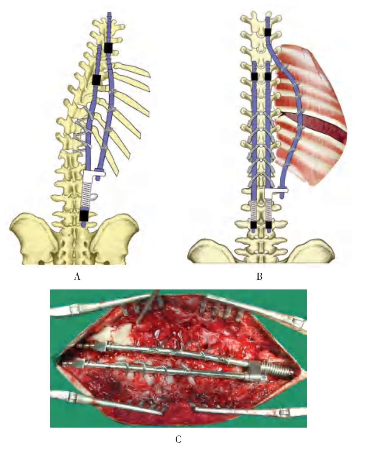 令患者戴颅盆环俯卧在已填好的手术床上,使人体与手术床之间垫实,不要让患者悬空在架子上,在局部浸润麻醉或全麻下消毒铺单后沿棘突切口,长约30cm,分层暴露棘突、椎板、关节突、横突和肋骨近段,特别是胸椎凹侧的肋骨要尽量向外侧剥离暴露塌陷变直的3~6根肋骨,不需要过多地显露凸侧的剃刀背,因为对剃刀背一般不做处理。下一步选择准备置钩或置钉的位置,将第一根棒上穿上垫圈、弹簧和棒间接头,第一根棒的上钩挂在低位胸椎的下关节突间顶在椎弓根上。第一根棒的尾端将钩挂在全椎板上,个别情况也可用椎弓根钉棒代替,对腰前凸过大或下部腰椎椎弓发育缺陷的病例,也可用骶骨棒代替。第一根棒无须过度折弯与椎板相服帖,穿在椎板下的Luque钢丝牵拉脊柱向第一根棒靠拢,产生横向矫正脊柱侧凸和固定棒的作用。将第二根棒的上钩挂在高于第一枚上钩以上相隔2~3个间隙的胸椎下关节突上,将棒折成弧形,通过肋骨的背侧将棒的尾端插入棒间接头的孔内,然后两棒交替撑开,使弹簧完全压缩脊柱侧凸产生一定程度的矫正,再将3~6条提肋钢丝固定在第二根棒上,将塌陷的肋骨提起,加大了胸腔容积,增加了棒的稳定性,并起到远跨度纵向撑开矫正脊柱侧弯的作用(图3-10)。术毕彻底止血,分层闭合切口,放置T形管引流,手术结束。