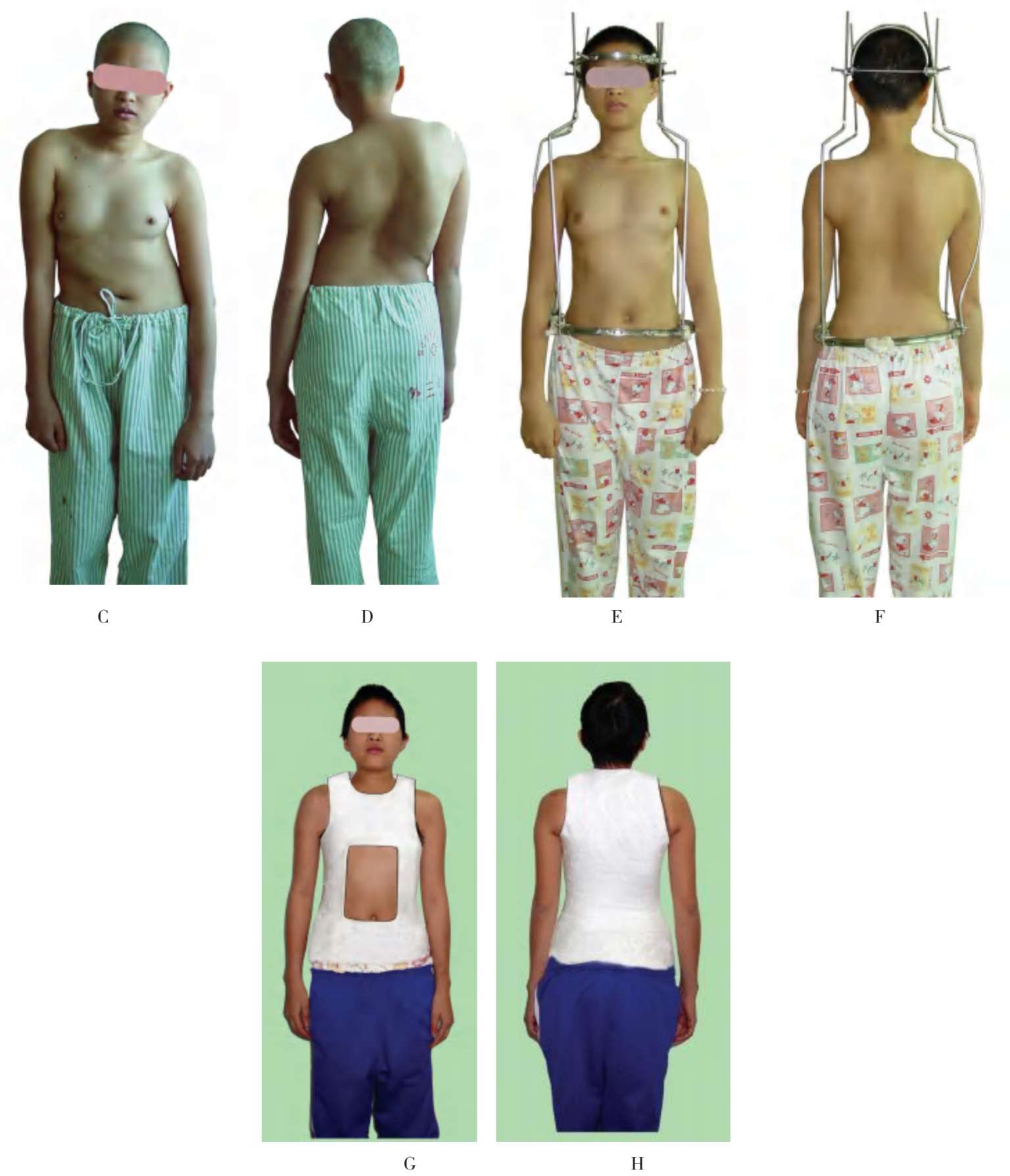 A.术前X线片示Cobb’s角104°;B.经颅盆牵引加弹性分叉生长棒矫正术后Cobb’s角变为20°;C、D.术前人体外形;E、F.颅盆牵引后人体外形;G.术后石膏背心外固定,正面观;H.背面观