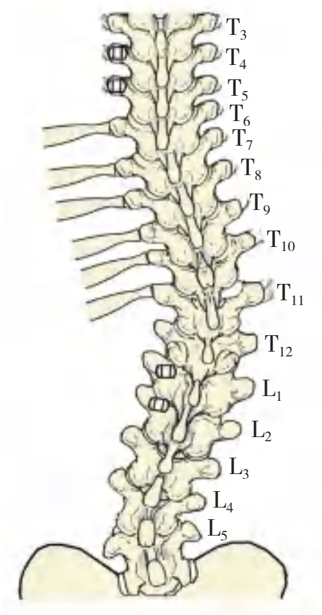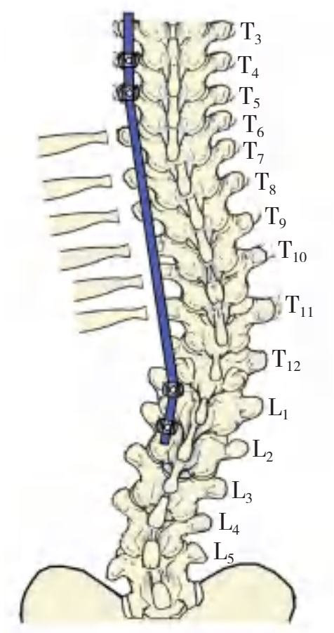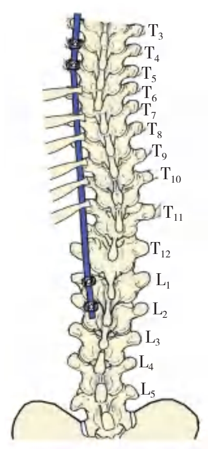 图3-13 已在T 4 和T 5 的横突上安装了两枚椎弓根外侧螺钉,又在L 1 和L 2 的椎板后安装了两枚椎弓根螺钉