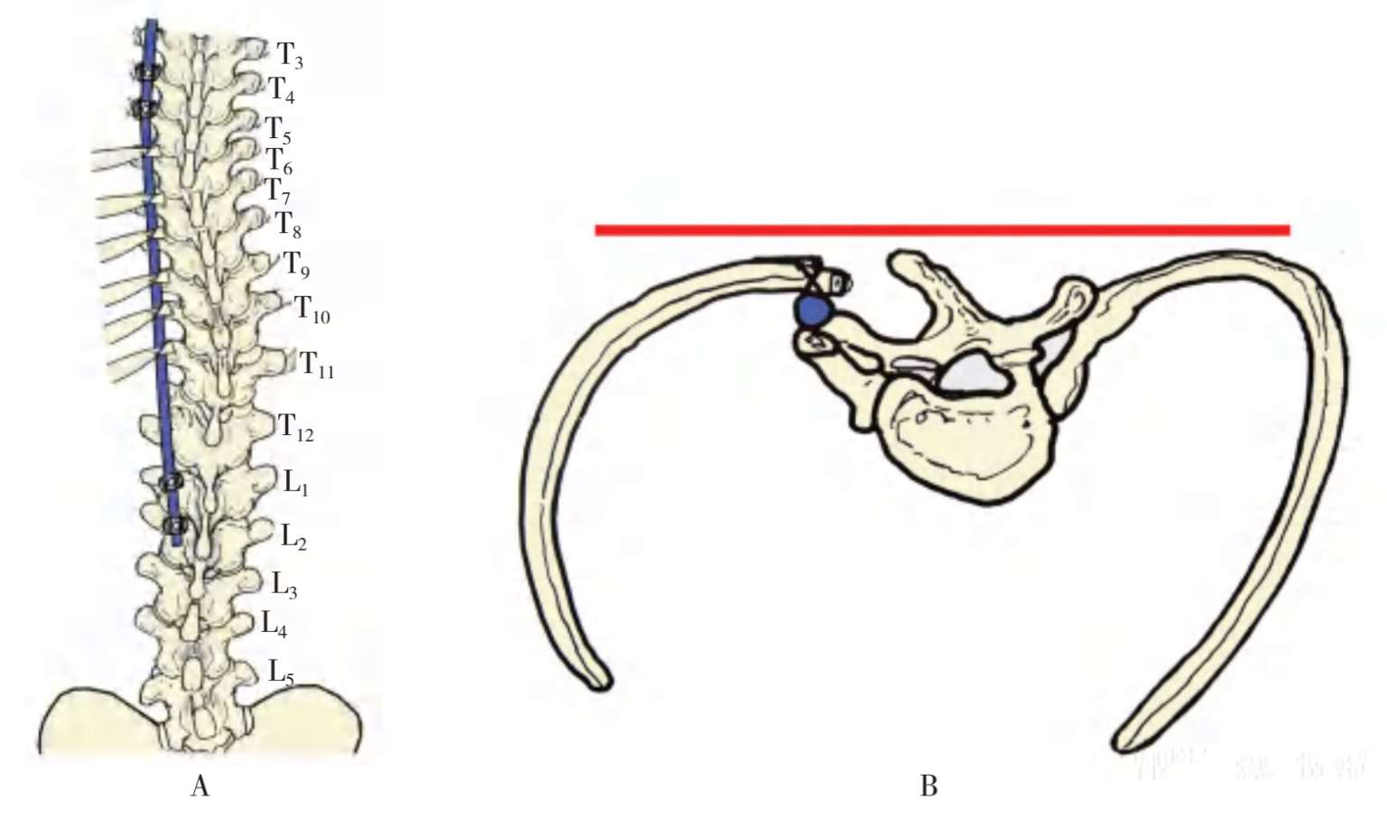 (2)在拟切断的4~6条塌陷肋骨的上端安装两枚椎弓根外侧螺钉,再在其下端的腰椎上安装两枚椎弓根螺钉,返回来处理肋骨(图3-13)。