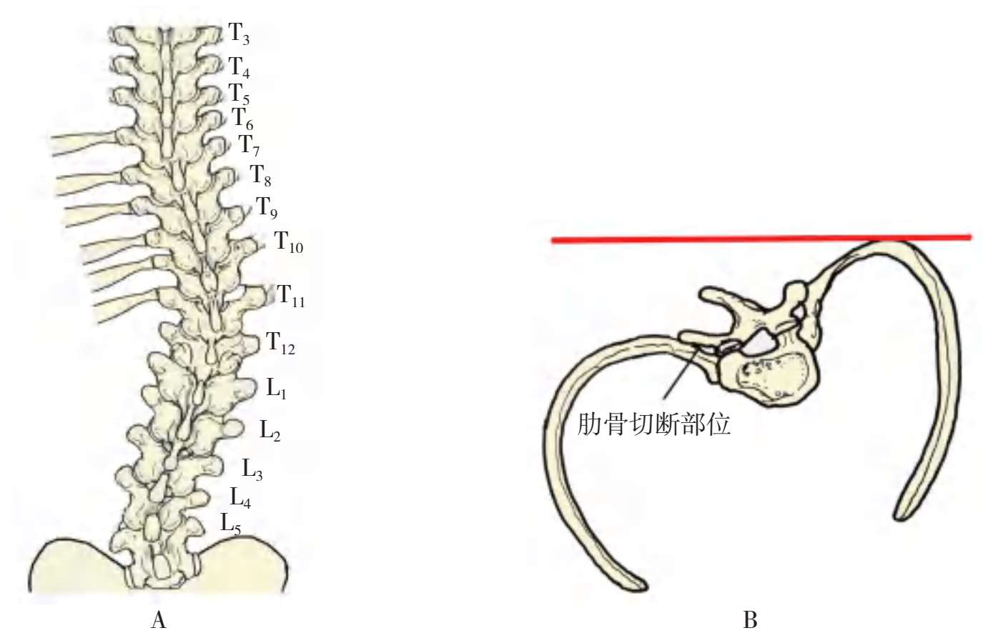 A.向凹侧暴露6条塌陷肋骨的背面;B.准备将塌陷肋骨截断后移,使背部取得平衡