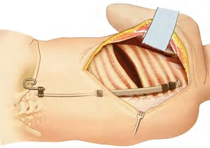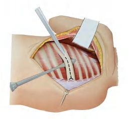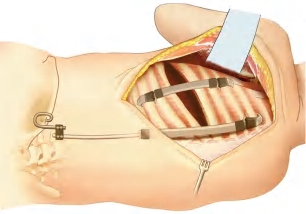 图3-34 肋骨-肋骨Vepter的上端支架安装在第三肋骨,下端支架安装在第九或第十肋骨。混合Vepter与肋骨-肋骨Vepter可联合应用,也可以单独应用