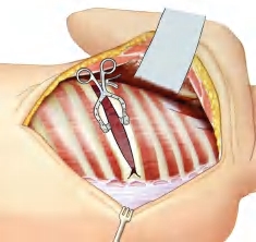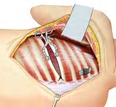 图3-29 用肋骨剥离器仔细地将肋骨剥离干净,注意保护肋骨深面的骨膜和壁层胸膜不能损伤