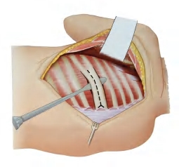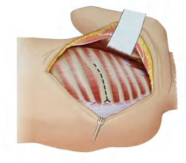 (2)切开并肋:在并肋的外侧切开肋骨骨膜时(图3-28),必须先将并肋段的骨膜仔细剥离开,特别是在剥离肋骨深面骨膜时不能损伤骨膜和壁层胸膜,以免造成气胸。将并肋段的骨膜剥离、游离干净后,在并肋下横穿剥离器(图3-29),以防在切开并肋时损伤胸膜。然后用骨刀自远端向近端截骨分开并肋(图3-30)。如果在肋骨颈和肋骨头之间还有骨性连接,可做Y形切开肋骨颈的1/2,使其在撑开时产生青枝骨折(图3-31)。