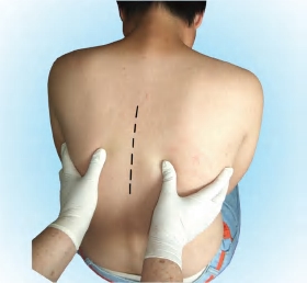 垂直可延长钛肋骨Vepter技术是美国食品药物管理部门注册的器械。根据笔者的应用结果,认为该器械仅限于应用在先天性并肋畸形的外科治疗,不适用于没有并肋、叉状肋或多发性肋骨骨性融合的病例。因为Vepter器械的支撑点是在肋骨上受力,其矫正脊柱侧弯的力量不足。对那些重度脊柱侧弯不存在并肋畸形的病例,特别是发育期间的儿童病例,颅盆牵引和弹性分叉棒的效果是较好的。所以它只适应做并肋畸形的矫正手术。如果拇指偏移试验(图3-24)证明肋椎关节活动度存在时,则不应采用Vepter器械治疗。如果拇指偏移活动度丧失、X线片上有并肋畸形存在时,则为Vepter技术的适应证(图3-25)。