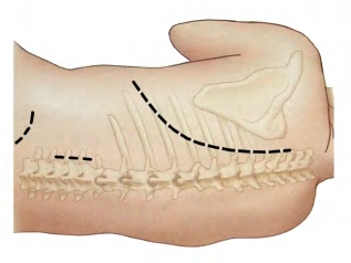 (1)切口与暴露:沿切口线(图3-27)切开皮肤及皮下组织,用电刀切开斜方肌、背阔肌、菱形肌。向外侧牵拉肩胛骨,触摸到第一肋骨,然后向下端剥离至第十肋骨。一般该手术常需要长切口做起来才方便,如果需要将Vepter固定在骨盆上或下腰椎的椎板上时,还需要在下腰椎的棘突旁或髂嵴的后上缘做第二个切口。
