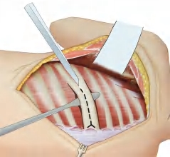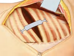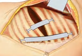 (5)用肋骨撑开器撑开肋骨:谨防将肋骨床及胸膜撑破造成气胸。应逐渐地慢慢撑开,撑开力不能过猛。