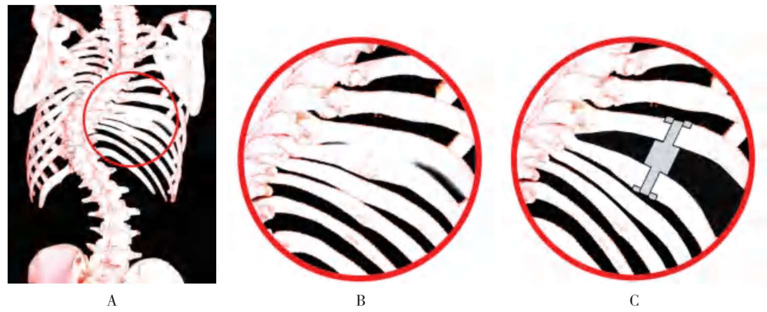 A.脊柱侧弯合并并肋畸形;B.并肋畸形的显示;C.切开并肋后,用局部撑开器撑开并肋间隙
