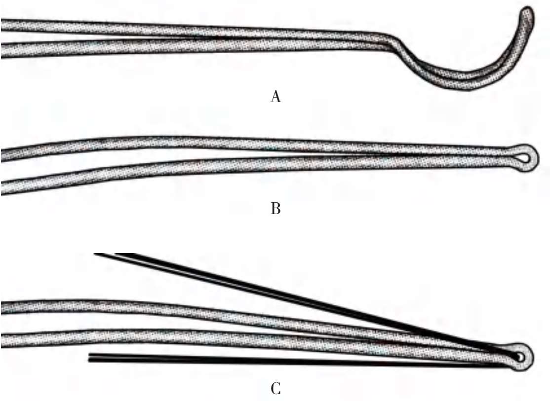 A.1.0直径的双股Luque钢丝,做成半圆形钩;B.Luque钢丝襻的末端留有圆孔,准备穿丝线用;C.双股10号丝线穿过圆孔,准备通过椎板下穿出,作牵引用
