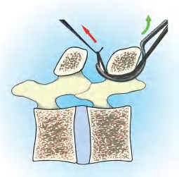 图3-64 助手用神经钩向外提拉丝线,术者将钢丝引导器紧贴椎板下,呈弧形方向退出