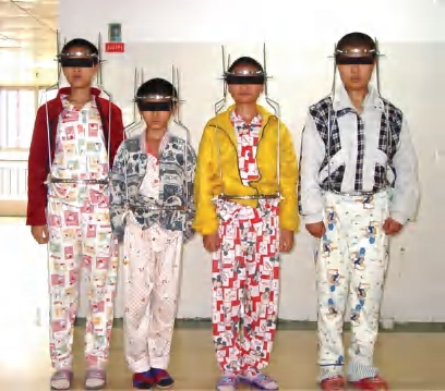 根据新疆脊柱外科研究所1980年开始应用颅盆环牵引配合手术治疗重度脊柱侧弯的临床经验,证实了Ilizarov牵拉成骨技术延长四肢的治疗方法,也可应用在颅盆环牵引治疗发育期间脊柱的弯曲畸形或牵拉成骨延长脊柱的方面。“时间变量”在治疗发育期间的脊柱畸形上具有很大的潜在力,能使传统手术和昂贵单纯器械所无法矫正的脊柱侧弯得到矫正。通过慢性牵拉成骨的作用,能使弯曲的脊柱伸直,能使侧弯凹侧挛缩的软组织蠕变松解,能使发育畸形的椎体和椎弓逐渐向着正常的方向衍变,能使侧弯凹侧的椎体间透明软骨间隙增宽,最后达到矫正脊柱畸形和延长脊柱的目的。通过1100例颅盆环牵引、截骨加器械矫正重度脊柱侧弯的临床实践经验(图4-1),利用颅盆环牵引,在缓慢逐渐拉直脊柱、三维矫正脊柱畸形的基础上,对10例发育期间的脊柱侧弯患者采用了单纯牵拉成骨技术,不做截骨和内固定手术,也不做脊柱融合术,对个别病例只做简单的凹侧松解或凸侧经皮穿针压缩的微创疗法。经过70~120天的牵拉成骨过程,使弯曲段脊柱的凹侧椎体高度增加、凸侧椎体高度减低,使原来的楔形椎体向着方形衍变。然后给予石膏背心外固定,避免了一次截骨矫正内固定的大手术,初步认为是一种有意义的微创手术方法,但尚需进一步研究积累病例以证实其最终治疗结果。
