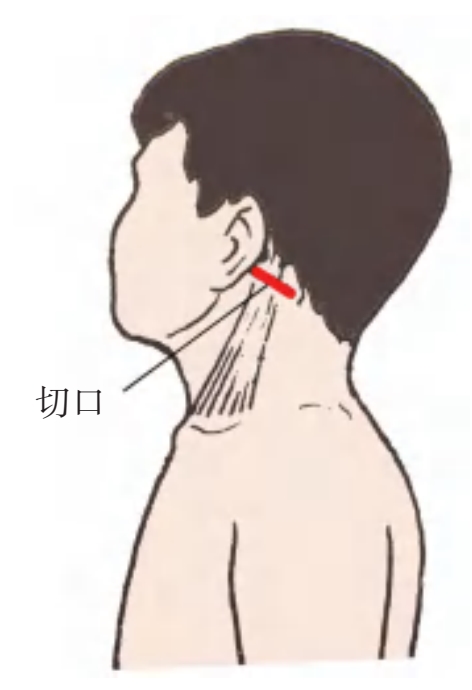 (1)胸锁乳突肌在乳突部附着点的部位,作2~3cm长的横切口(图1-40)。