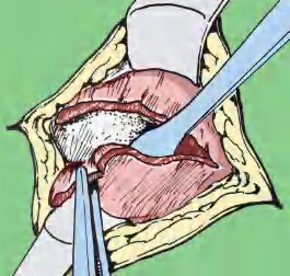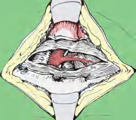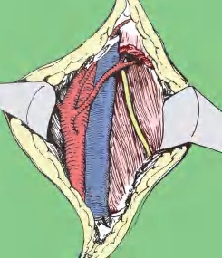 (2)然后用手指触摸其后鞘,如有挛缩的筋膜组织,应小心地切断松解(图1-37),注意勿伤及深层的大血管。