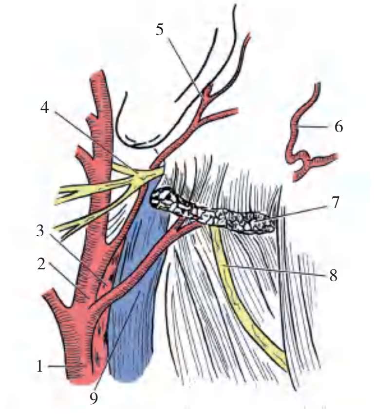 1.颈总动脉;2.颈外动脉;3.颈内动脉;4.面神经;5.耳后动脉;6.枕动脉;7.胸锁乳突肌断端;8.副神经;9.颈内静脉