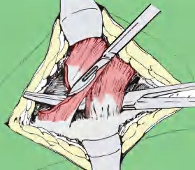 图1-36 在胸骨头和锁骨头的深层,通过一把弯血管钳,挑起肌腱,用尖刀片切断