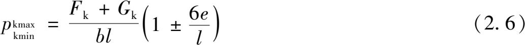 对单向偏心荷载作用下的矩形基础,如图2.7所示,一般取基底长边方向与偏心方向一致。此时基底两端最大压力值 p kmax 和最小压力值 p kmin 按材料力学偏心受压公式计算