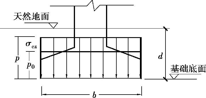 在实际工程中,一般基础都埋置在天然地面以下一定深度处,该处原有的自重应力由于开挖基坑而卸除,因此,由建筑物引起的基底压力应扣除基底标高处的自重应力,才是基底处新增加的附加压力,也称基底净压力,如图2.10所示。其大小可计算为