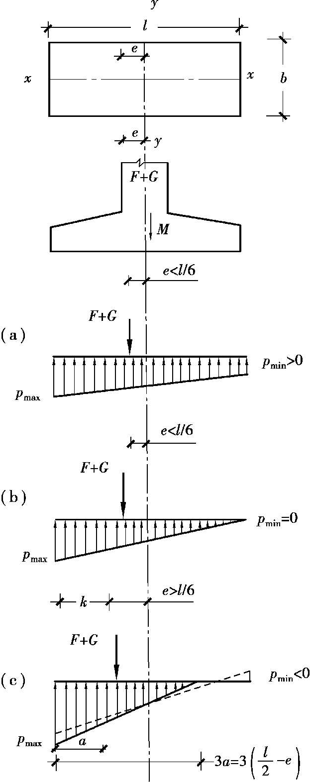 图2.8 偏心荷载( e > l /6)下基底压力计算示意图