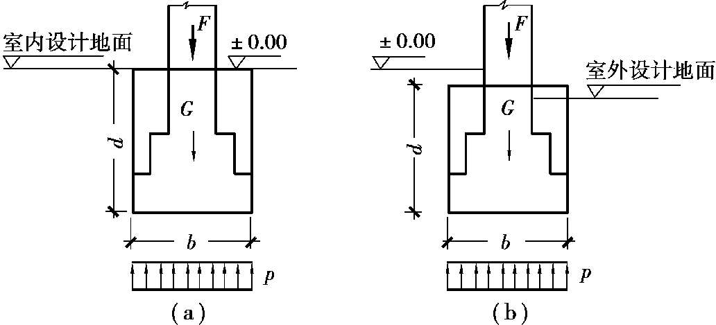 G k ——基础自重和基础上的土重,kN; G k = γ G × A × d , γ G 为基础及回填土的平均重度,一般取20kN/m 3 ,但在地下水位以下部分应扣除浮力,即取 γ G ′= 10kN/m 3 ; d 为基础埋置深度,m,应从室内外平均设计地面算起;