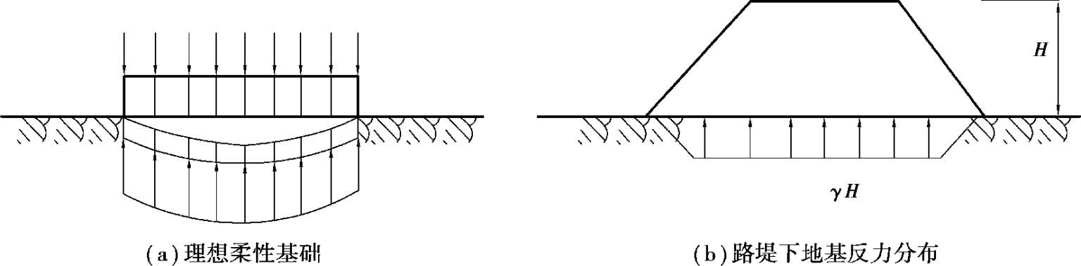 当基础是柔性的(抗弯刚度 EI →0),基础变形能完全适应地基表面的变形,则基底压力分布与作用在基础上的荷载相似。例如,由土筑成的路堤,可以近似认为它是一种柔性基础,路堤自重引起的基底压力分布与路堤断面形状相同,是梯形分布,如图2.4所示。