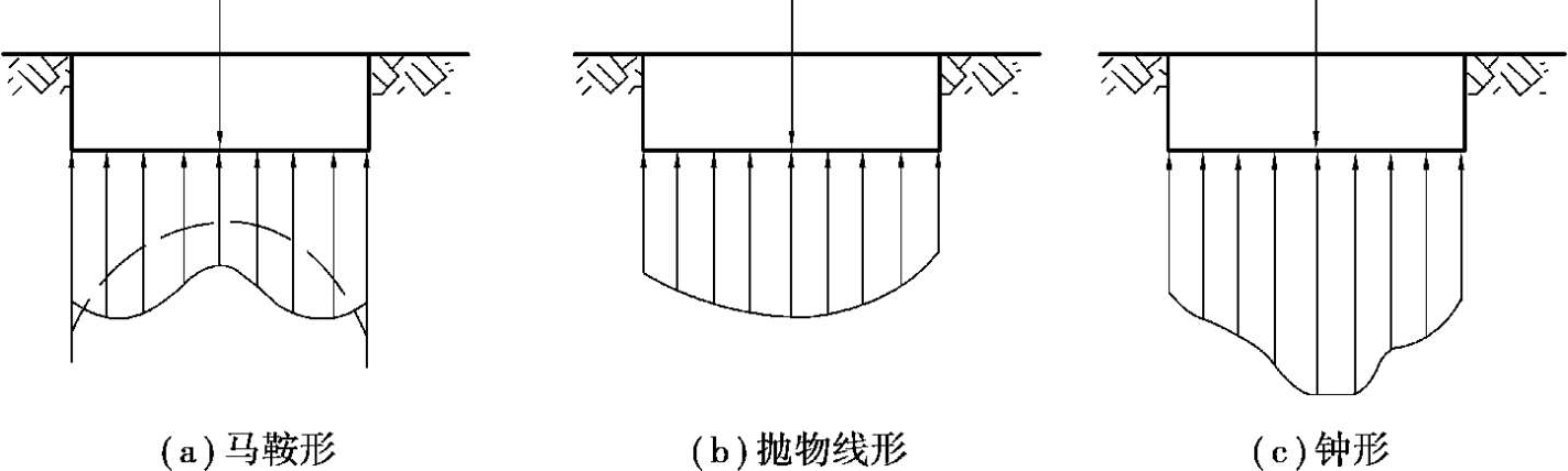 若基础刚度很大或为绝对刚性( EI →∞),基底压力分布就不同于上部荷载分布情况。基底受荷后仍保持水平,各点沉降相同,理论上来说,基底压力四周大中间小,如图2.5(a)中虚线所示。试验及测试表明,对刚度较大的基础,基础边缘地基土产生塑性变形后,基底压力重分布,边缘压力向内转移,基底压力分布呈马鞍形,如图2.5(a)中实线所示。随着上部荷载的逐渐增大,基础边缘土中应力很大,会使基础边缘地基土塑性变形区扩大,基底压力将由马鞍形变成拋物线形,如图2.5(b)所示,以致最后呈现为钟形而地基濒于破坏,如图2.5(c)所示。