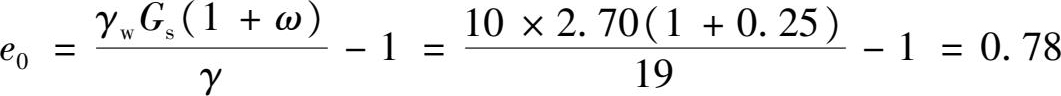 例 3.1已知某原状土样高 h 0 = 20mm,截面积 A = 30cm 2 ,重度 γ = 19.1kN/m 3 ,颗粒比重 G s = 2.72,含水量 ω = 25%,进行压缩试验,试验结果见表3.1,求土的压缩系数 a 1-2 值,并判断土的压缩性大小。