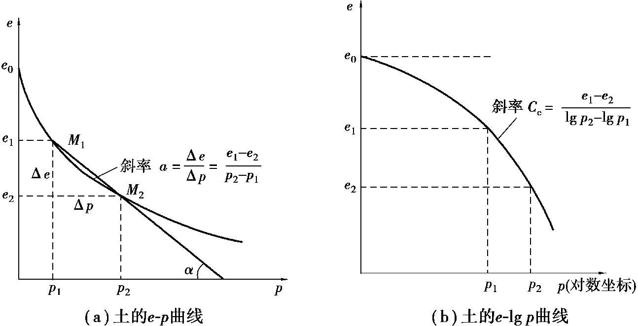 e-p 曲线初始较陡,土的压缩量较大,而后曲线逐渐平缓,土的压缩量也随之减小。这是因为随着孔隙比的减小,土的密实度增加一定程度后,土粒移动越来越趋于困难,压缩量也减小的缘故。不同的土类,压缩曲线的形态有别,密实砂土的 e-p 曲线比较平缓,而软黏土的 e-p 曲线较陡,土的压缩性高。曲线上任一点的切线斜率 a 表示了相应压力 p 作用下的压缩性,即