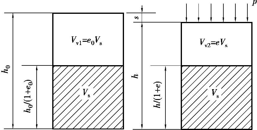 土颗粒的压缩量是微小的,忽略不计,压力施加前后土粒体积不变,假设 V s = 1,根据土的孔隙比的定义,则受压前后土孔隙体积分别为 V s e 0 和 V s e ( e 0 为土的初始孔隙比、 e 为受压后土的孔隙比)。