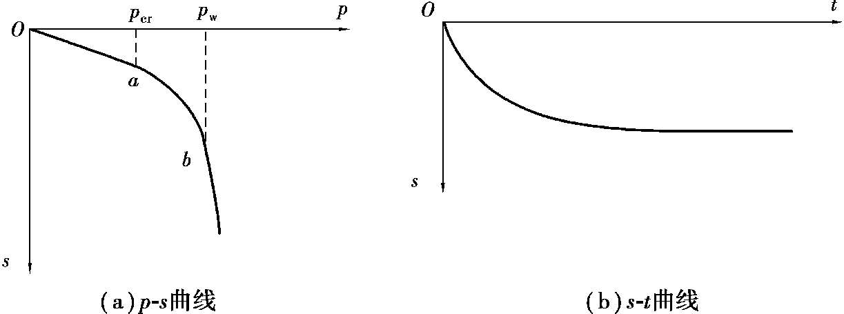 载荷试验应精细地进行,特别注意保持试验土层的原状结构和天然湿度。载荷板范围地面禁止踩踏,不得在表面反复刮、抹。宜用10~20mm的粗、中砂找平。加荷等级不少于8级。最大荷载应加至最大设计荷载的1.5~2倍。每加一级荷载后,按间隔10,10,10,15,15min读记载荷板沉降一次。以后每半小时读记一次,当连续2h内,每小时的沉降不大于0.1mm时,即可加下一级荷载。试验结果应绘制成 p-s 曲线和 s-t (时间)曲线,如图3.8所示。