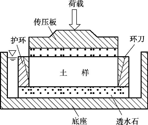 室内侧限压缩试验(又称固结试验)采用的试验设备为固结仪,如图3.2所示。其中,金属环刀用来切取土样,金属环刀及刚性护环的限制,使得土样在竖向压力作用下只能发生竖向变形,无侧向变形。